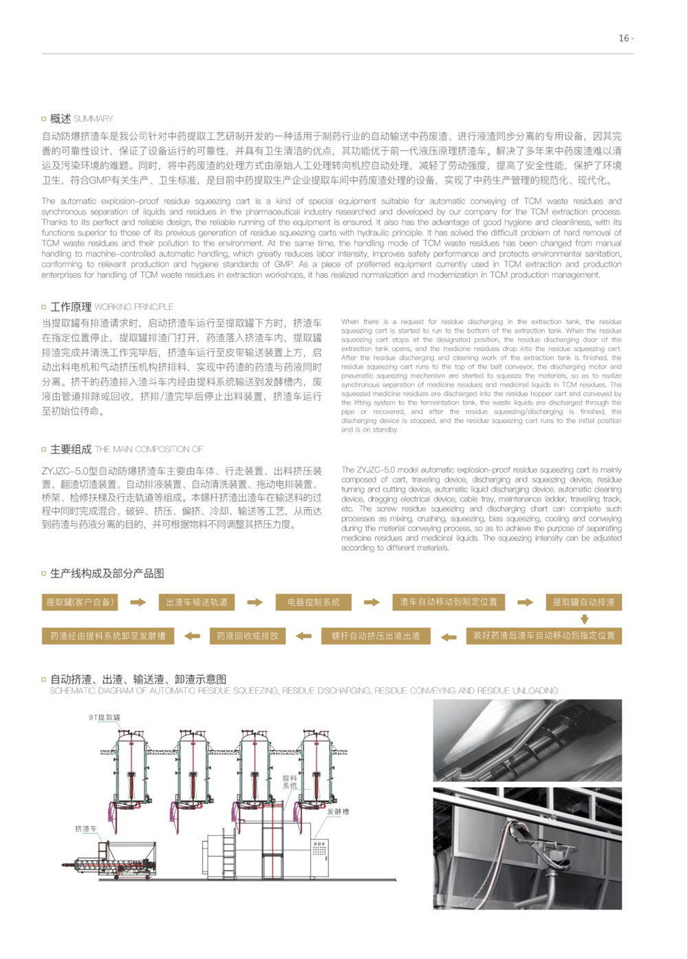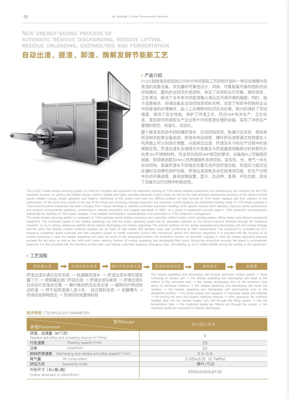 ZYJZC型除渣系統(tǒng)是我公司針對中藥提取工藝研制開發(fā)的一種自動清理中藥廢渣的成套設(shè)備。其完善的可靠性設(shè)計(jì),間接、可靠極富可操作性的自動控制模式、整機(jī)的全封閉外觀結(jié)構(gòu),保證了系統(tǒng)的運(yùn)行可靠、操作簡單衛(wèi)生清潔、解決了多年來中藥廢渣難以清運(yùn)及污染環(huán)境的難題。